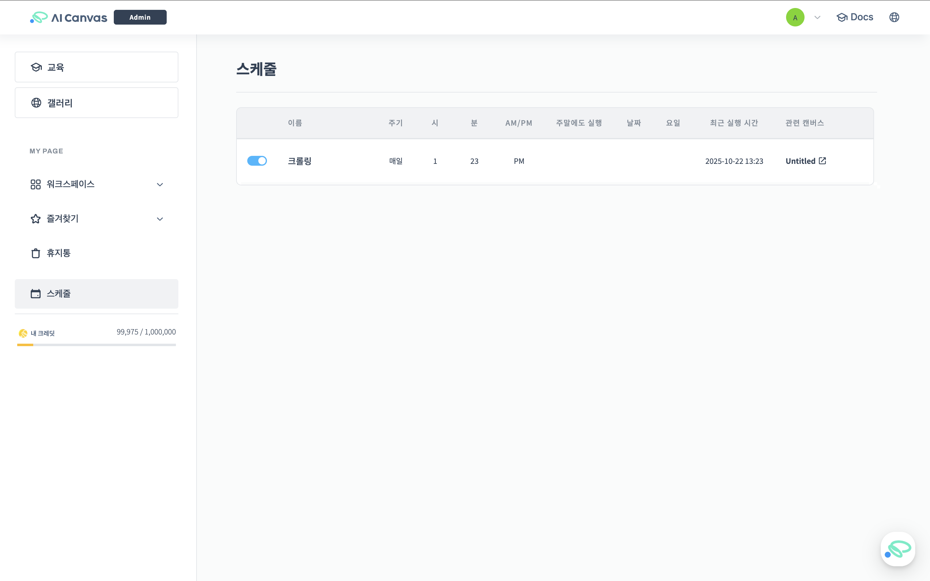 워크스페이스 목록에서 스케줄을 클릭합니다.